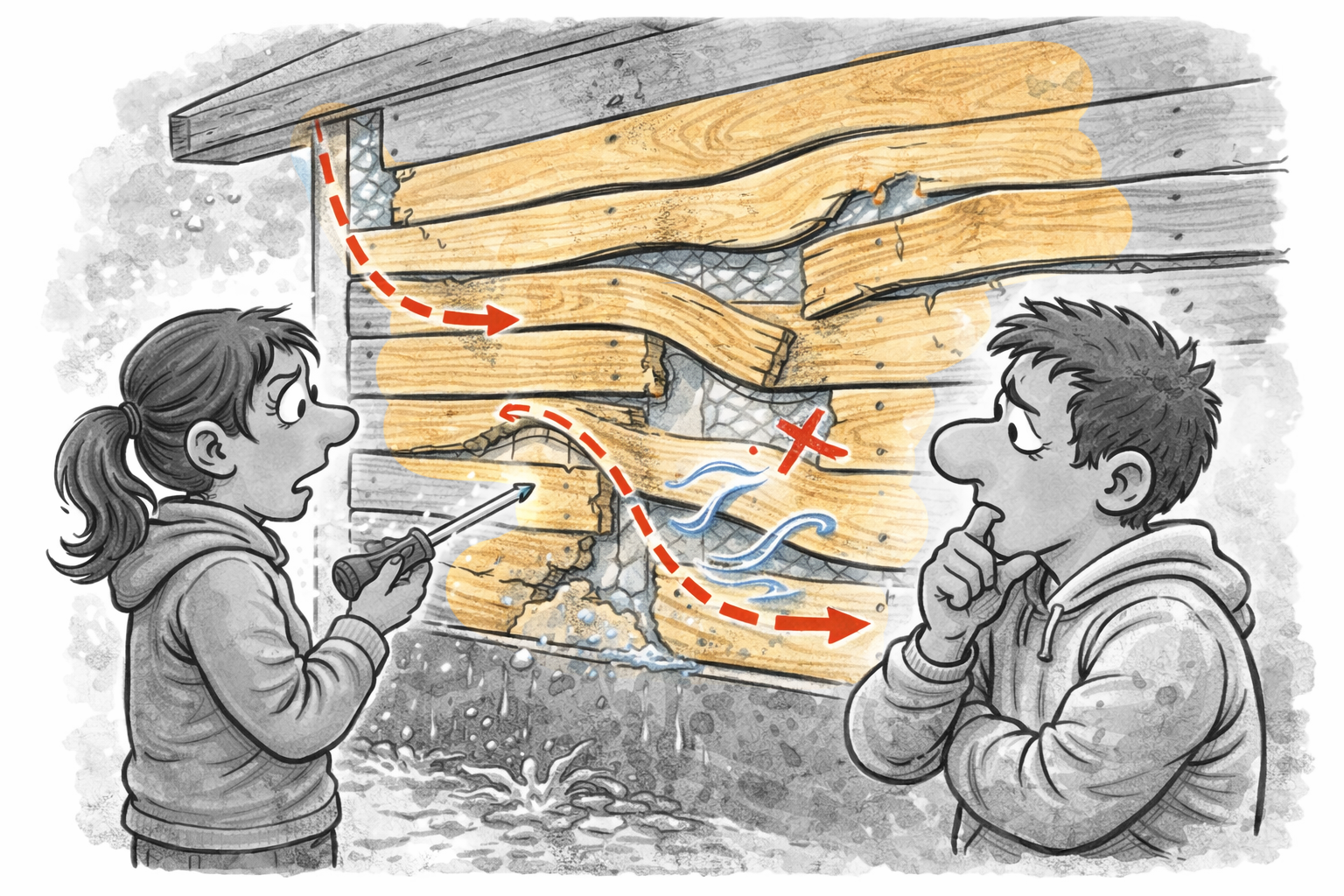 Eine Holzfassade wird ohne saubere Hinterlüftung, mit falscher Befestigung oder ohne ausreichend Fugen/Bewegungsspielraum montiert.